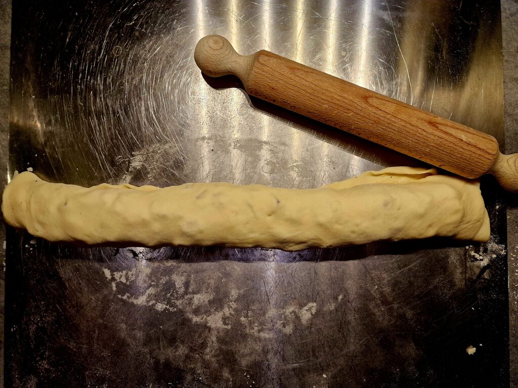 • Snijd de rol in plakken van drie of vier centimeter, waardoor Napolitaanse broodjes ontstaan die je op de bakplaat met bakpapier legt.