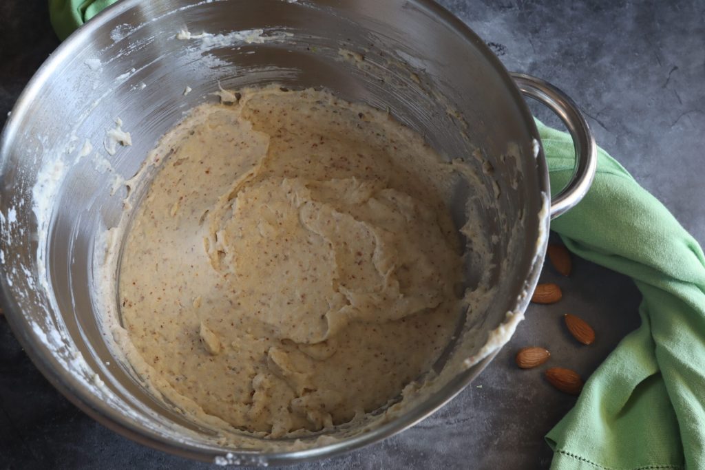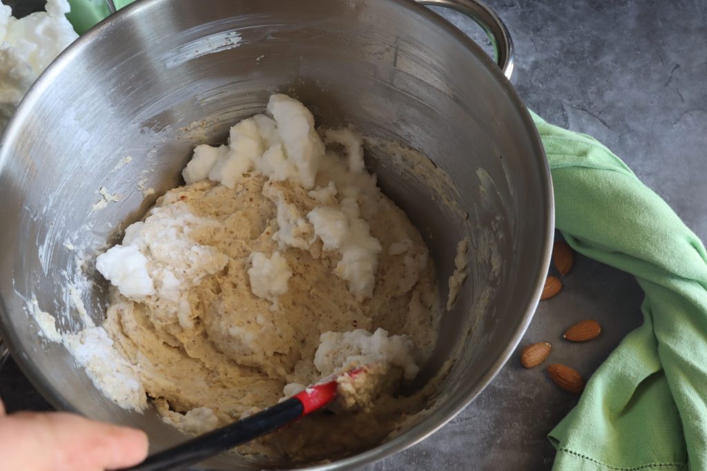 Met de spatel voeg ik de gemalen amandelen toe zonder het mengsel te laten inzakken.