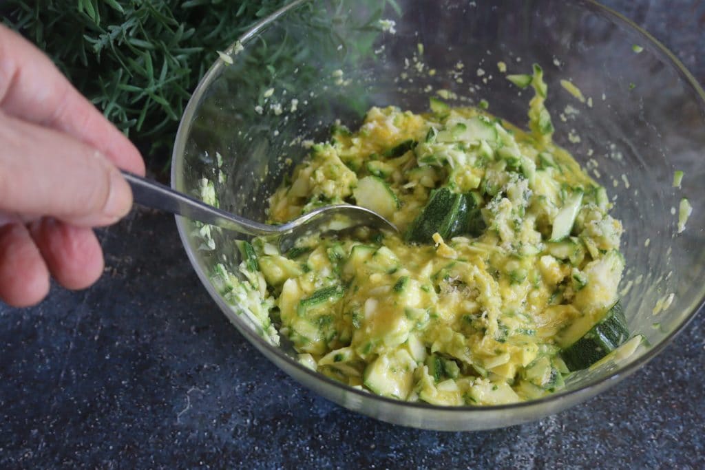 Mix de courgettevulling met eieren en Parmezaanse kaas.
