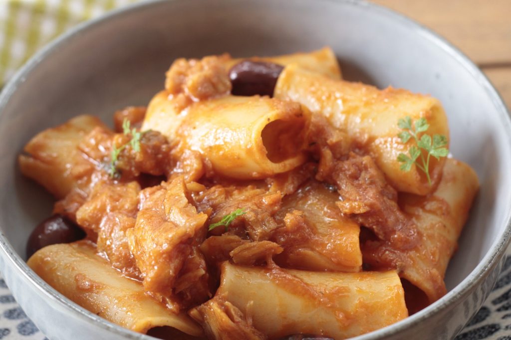 • Bereid de paccheri al dente en voltooi het koken in de stokvissaus. Voeg indien nodig een klein pollepeltje kookwater van de pasta toe.