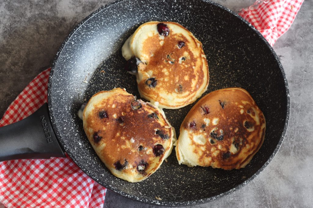 Soms laat ik mijn pannenkoekenbeslag met bosbessen 15 minuten in de koelkast rusten. Deze stap is niet strikt noodzakelijk, maar ik heb gemerkt dat de pannenkoeken beter worden als ik het beslag laat rusten.