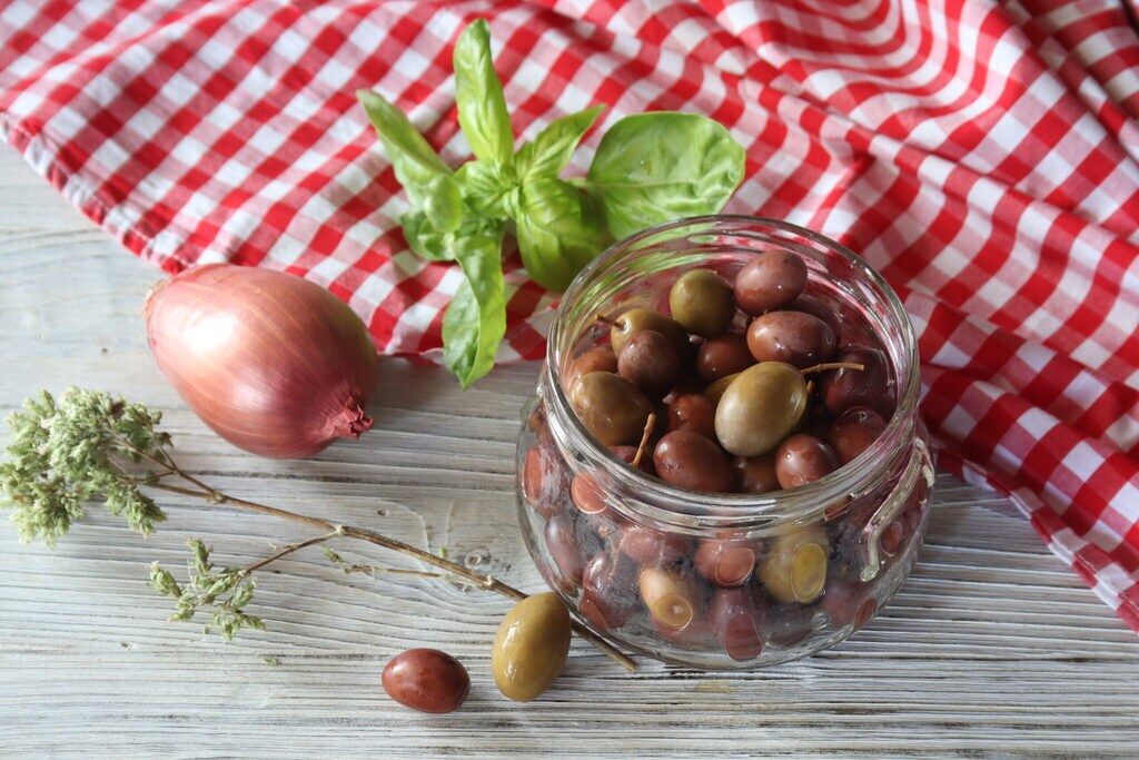 Terwijl ik de ingrediënten voorbereide, maak ik als eerste de ui schoon, snijd deze in plakjes en laat deze in koud water liggen tot het moment van gebruik. Ik was de basilicum en de huisgemaakte olijven in pekel gekocht in Puglia in september.