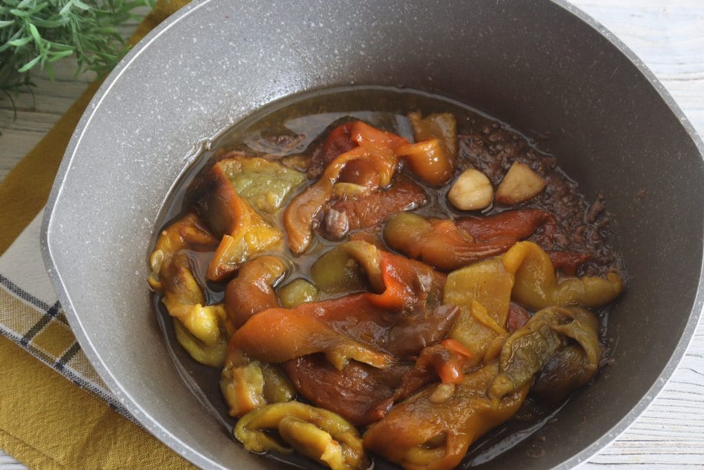 • ik in een koekenpan de knoflook met de olijfolie fruit. Ik voeg de ansjovis in olie toe en plet ze met een houten lepel zodat ze zich mengen met de olie. Ik zet het vuur uit en voeg de gegrilde paprika’s in de pan toe, zodat ze goed samen mengen om op smaak te komen.
