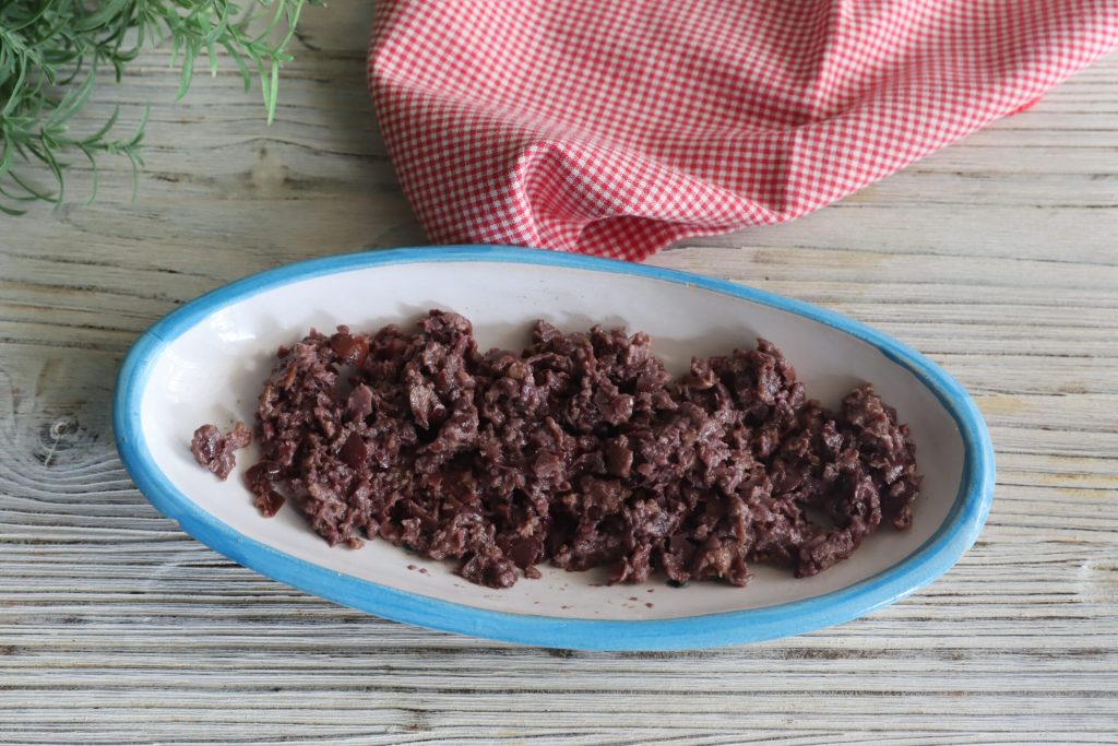 In de hakker doe ik de ontpitte taggiasche olijven en hak ze bijna tot een pasta, net daarvoor.