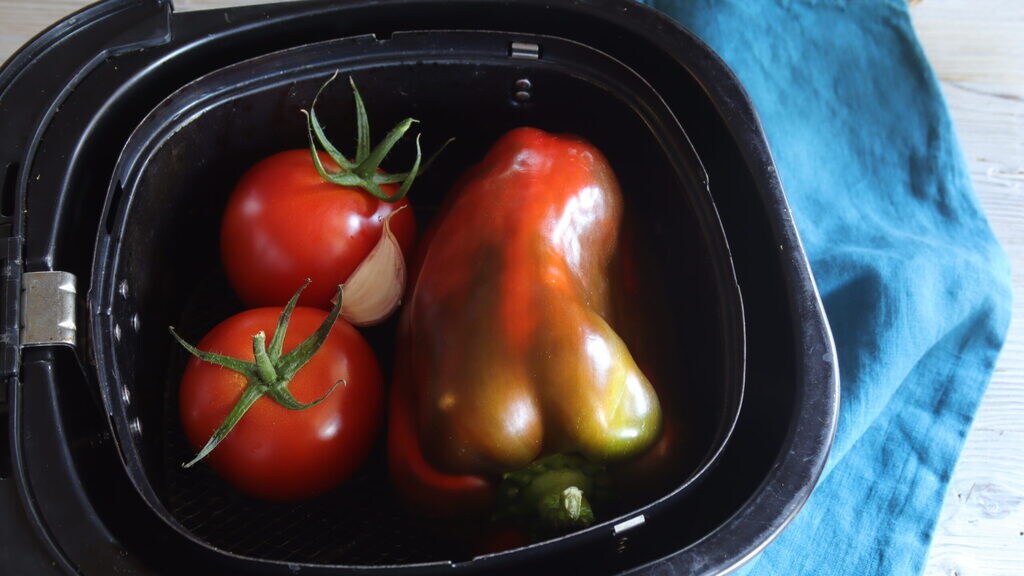 • Ik heb de tomaten, knoflook en paprika in de heteluchtfriteuse gedaan en op maximale kracht, 200°C, heb ik ze 20 minuten gekookt.
