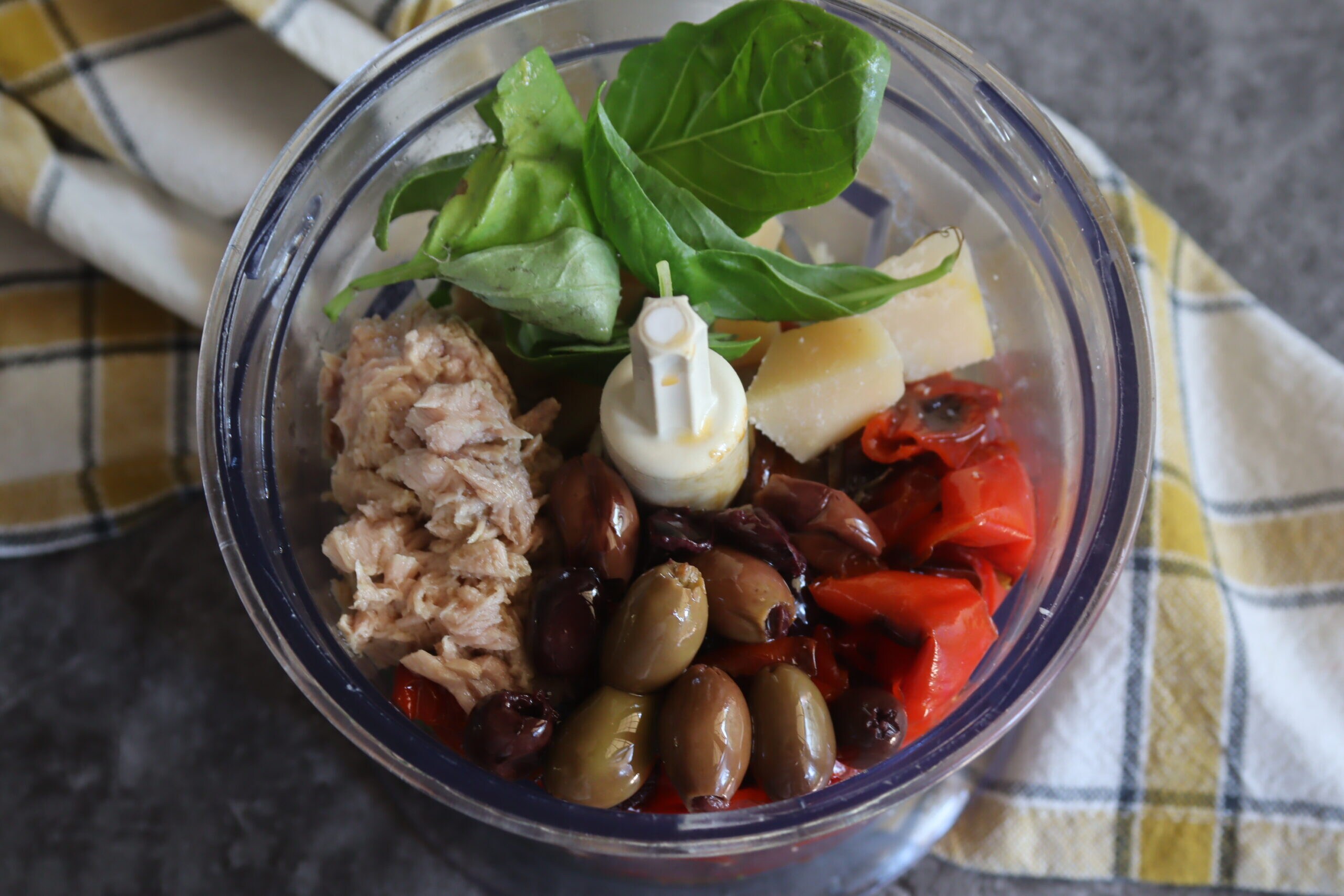 Hier is de pesto met tonijn, olijven en paprika klaar, perfect voor op bruschetta of om pasta te bereiden.
