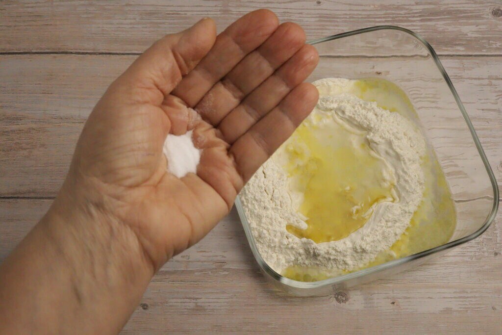 Voeg de extra vierge olijfolie toe aan de bloem in een kom, maar je kunt het ook direct op het werkblad doen.