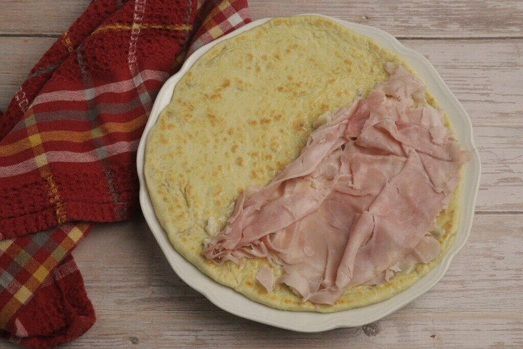 Verwarm de grillplaat (een pan is ook goed) en zodra het heet is, bak je de piadina een paar minuten, draai je het om en bak je het verder tot je kleine belletjes ziet.