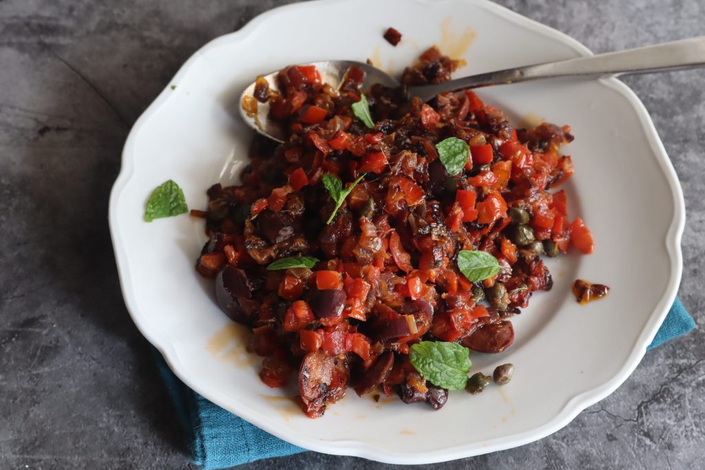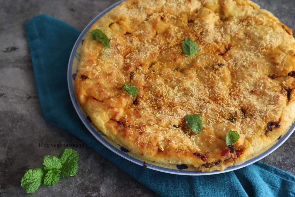 Pitta di patate salentina, een soort focaccia bestaande uit twee lagen geplette en gekruide aardappelen, met daarin een vulling van uien gekookt met tomaten, olijven, kappertjes en ansjovis. Oregano is onmisbaar om het recept uit het Zuiden te bekronen. De twee lagen aardappelen worden goed gekruid met munt, eieren, veel pecorino, paneermeel, zout en peper. Voor de vulling kan desgewenst ham, tonijn, sardines of veel groenten worden toegevoegd, zoals ik graag doe. Het is duidelijk dat wie in Puglia is geweest en de lokale keuken heeft geprobeerd, het moeilijk vindt om het te vergeten en nog moeilijker om thuis te komen en te proberen dezelfde smaken niet na te maken.