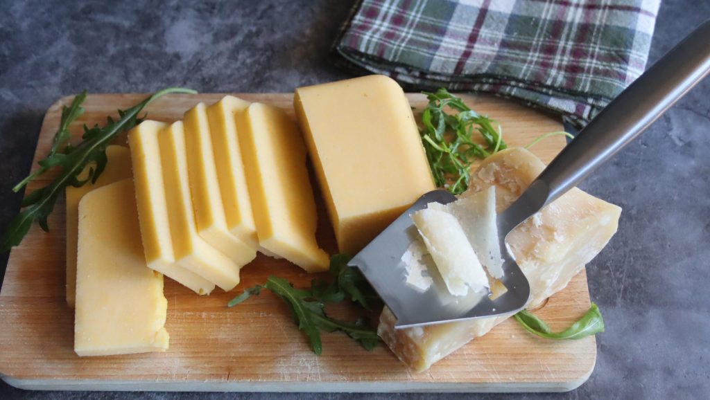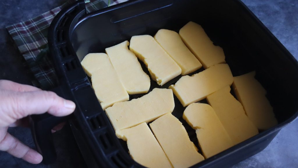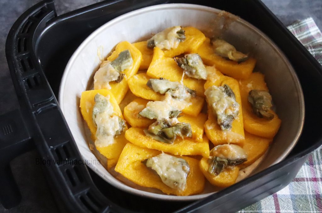 Na de tijd, haal de polenta uit de airfryer, leg het in een ovenschaal en garneer met stukjes eerder gekookte en gesneden artisjok en dunne schilfers Parmezaanse kaas bovenop.
