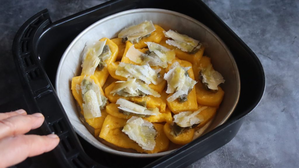 Plaats opnieuw in de airfryer op grillstand gedurende 3 minuten, de tijd die nodig is om de Parmezaanse kaas te smelten.