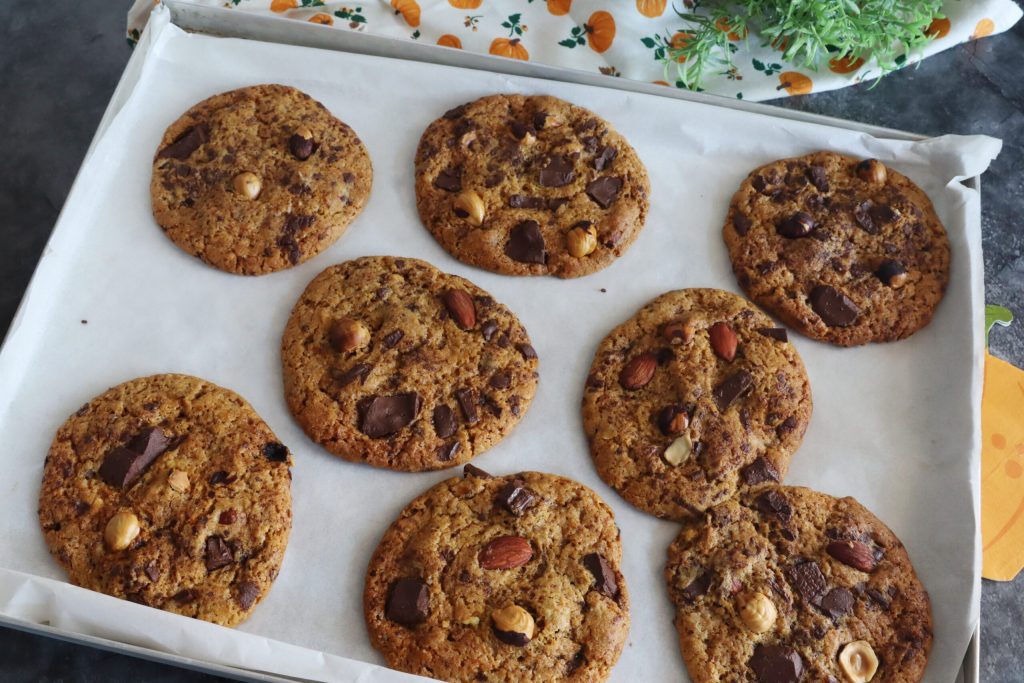 In de glazen kom voeg je de bloem samen met de twee soorten suiker, het bakpoeder en het snufje bicarbonaat. Voeg de boter met de pompoen toe en ten slotte de amandelen, hazelnoten en de stukjes chocolade.