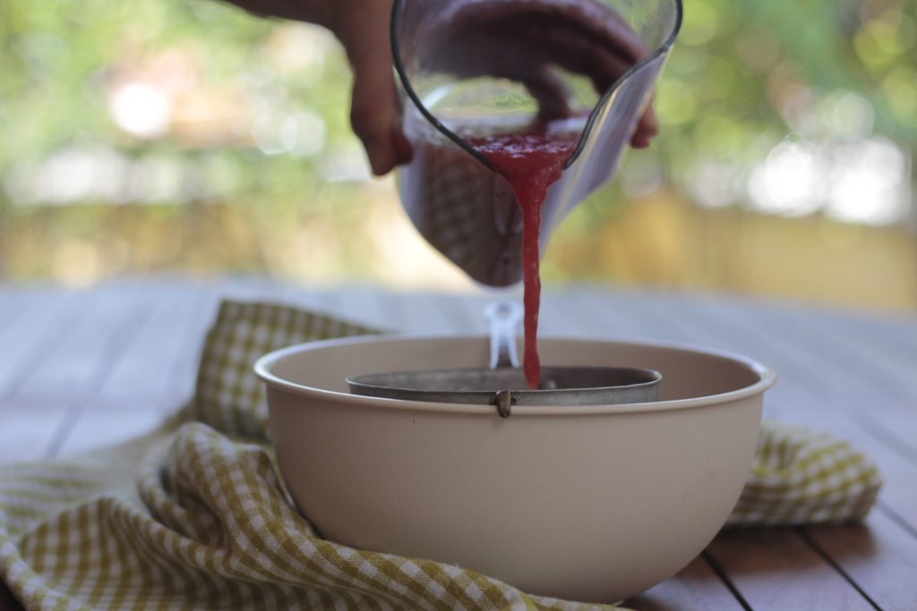 Gebruik een vergiet om overtollig water uit de met de grofzeef gepureerde tomaten te verwijderen