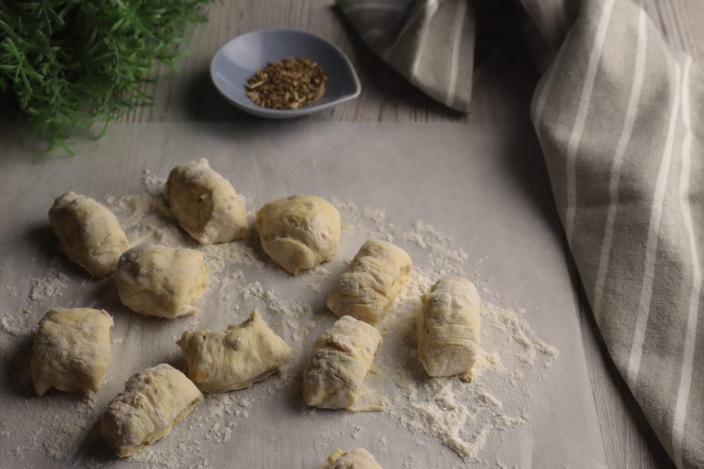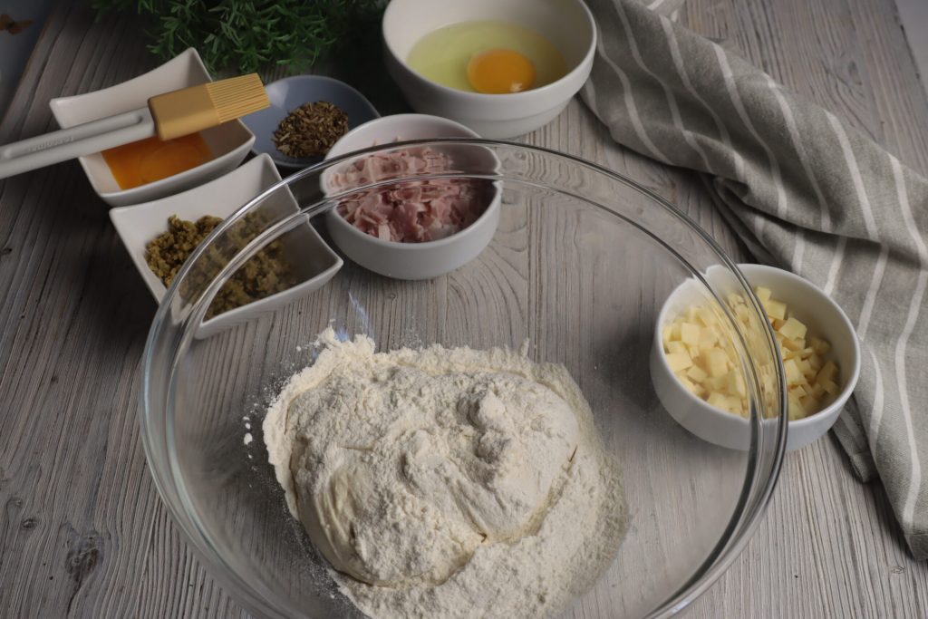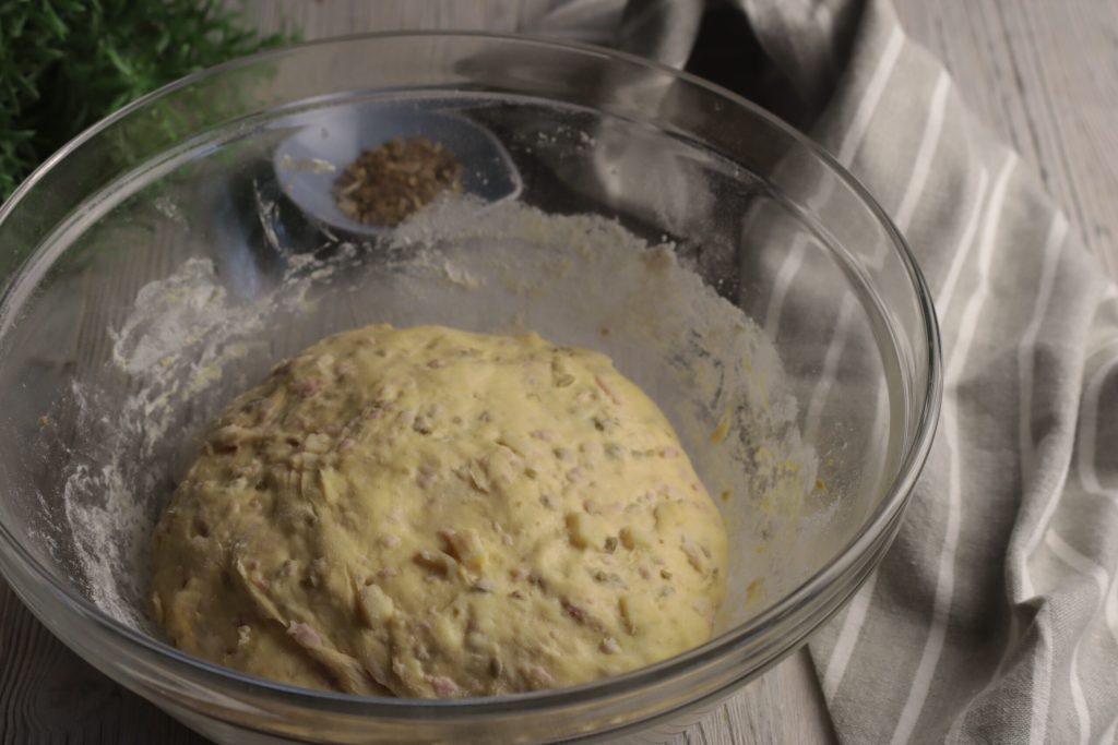 • Verwerk de kaas en de gekookte ham door het deeg,