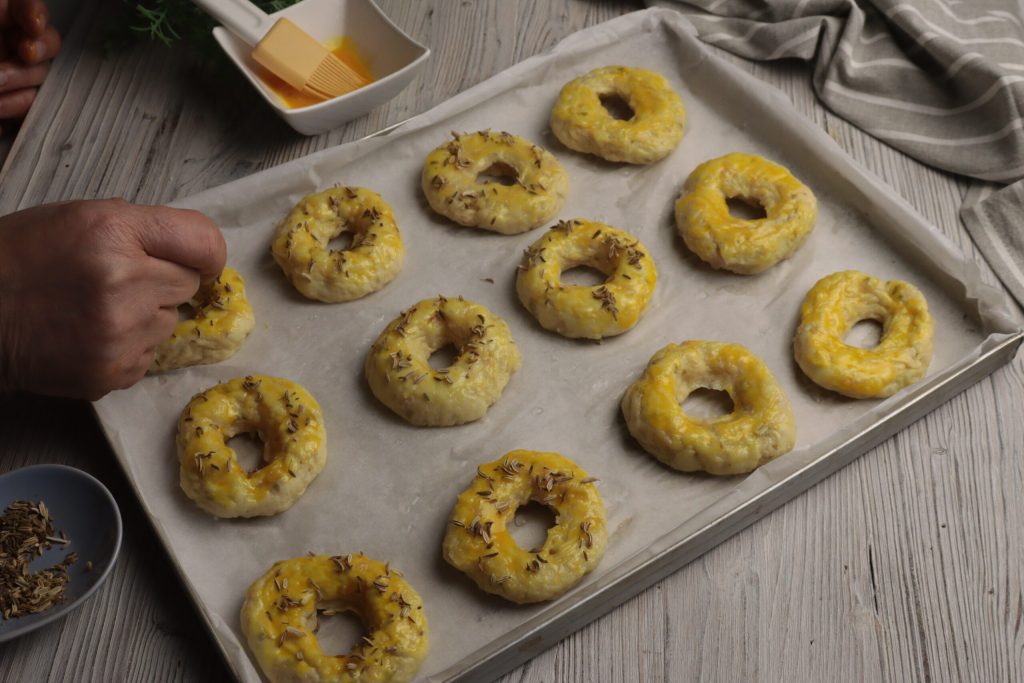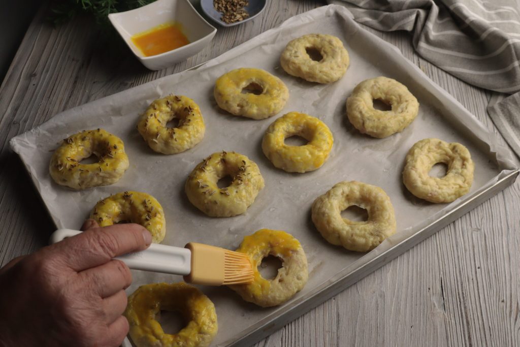 • Bestrijk alle ringetjes met losgeklopt ei,