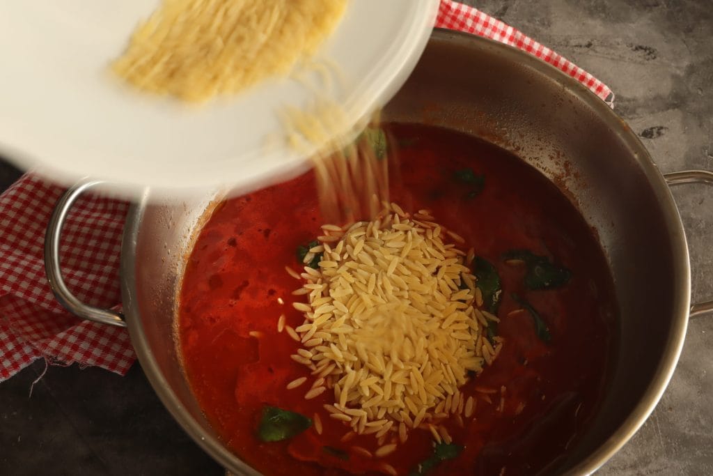 Giet de ongekookte risoni direct in de saus en verdun met warme bouillon of warm water.