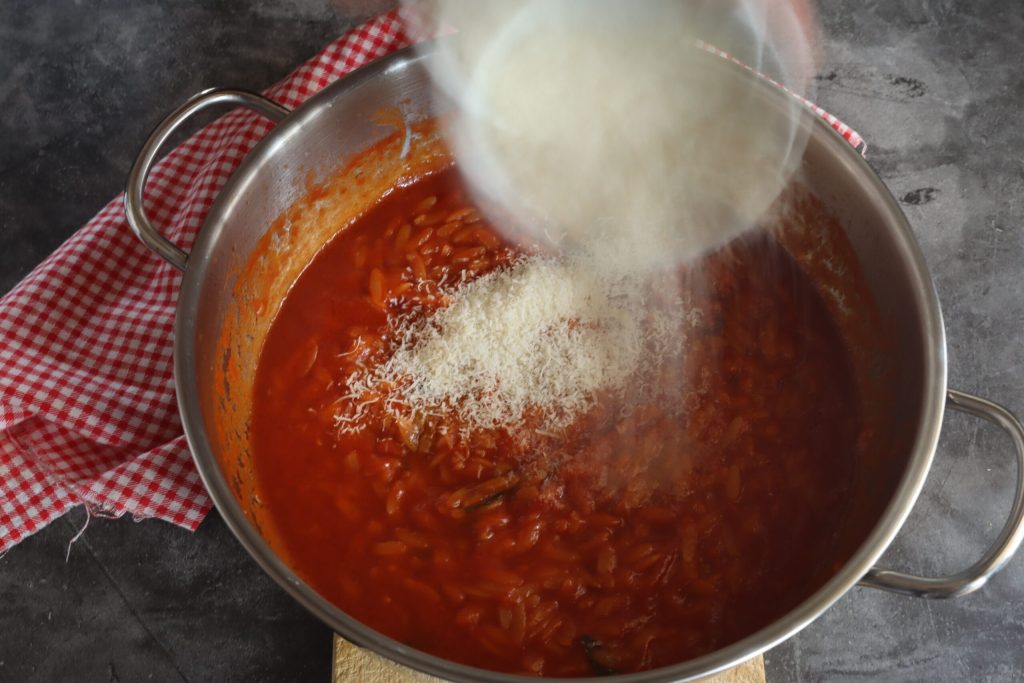 voeg de Parmezaanse kaas en nog wat verse basilicum toe. Een scheutje extra vergine olijfolie koud en het gerecht van risoni met tomaat is klaar om te worden geserveerd.