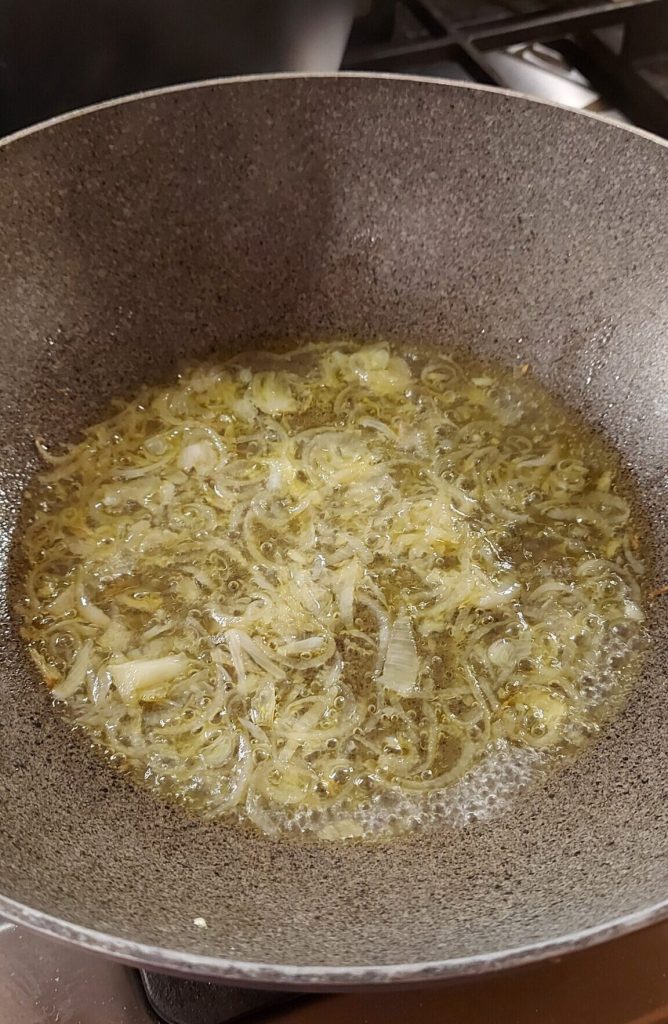 Ik heb de ui dun gesneden en in de wok met de extra vierge olijfolie laten fruiten.