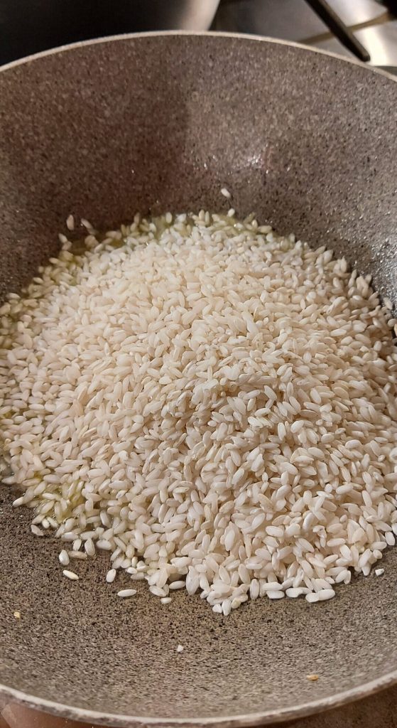 Zodra de ui goudbruin is, voeg ik de Carnaroli-rijst toe om te roosteren.