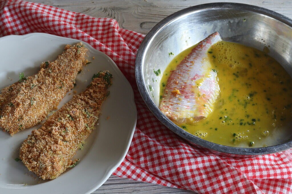Ik bereid de rode mul filets met citroen voor door ze meerdere keren in het paneermeel te draaien en te drukken.
