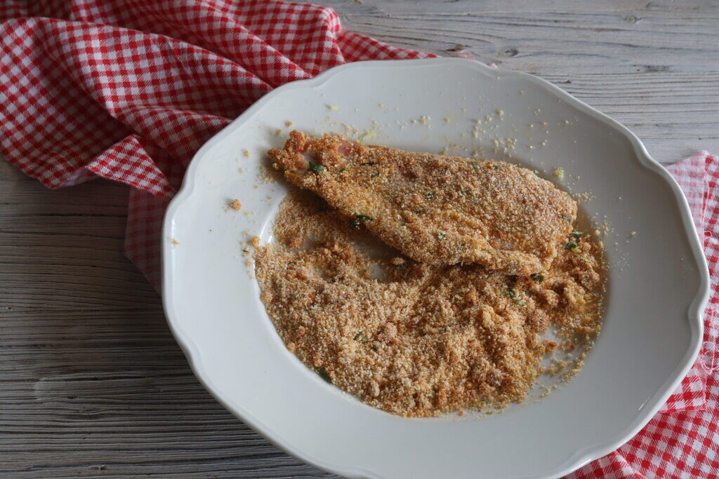direct daarna in het goed gemengde en gekruide paneermeel.