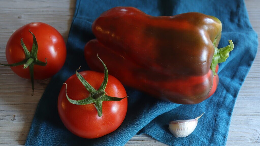 • Ik heb de paprika in een papieren zak gedaan omdat dit mij hielp de huid veel gemakkelijker te verwijderen. Ik heb de tomaten gepeld en de knoflook geschild.