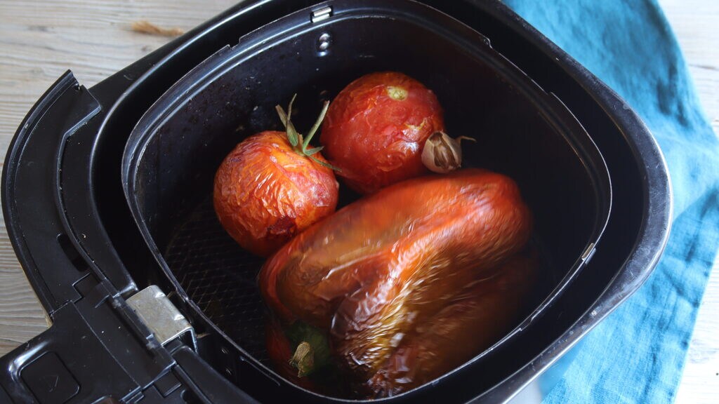 • Ik heb de tomaten, knoflook en paprika in de airfryer gezet (uiteraard alles van tevoren gewassen).