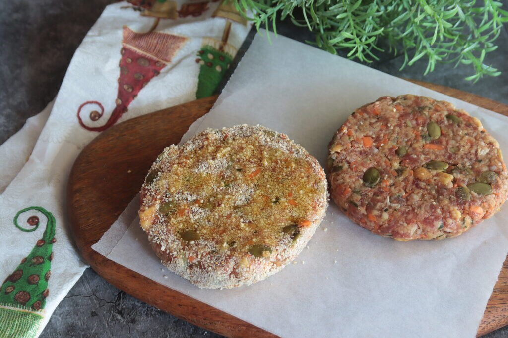 • Het gehakt moet met de hand worden bewerkt, dus nadat alle ingrediënten goed zijn gemengd, vorm je met de speciale pers 4 hamburgers of gebruik anders een koekjesvorm. Als je wilt, kun je de hamburgers voor het bakken in het paneermeel dopen.