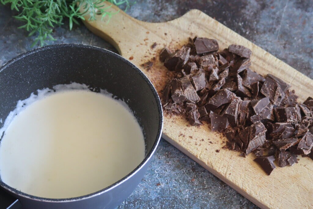 Haal de room van het vuur zodra het kookt en dompel de fijngehakte pure chocolade erin.