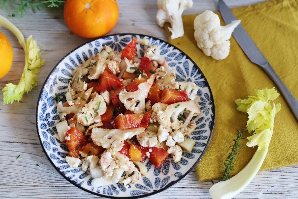 Sinaasappel en bloemkool salade, het lijkt misschien een fris en zomers gerecht, maar ik zal je vertellen dat het zelfs in februari met de kou niet te versmaden is, een mooie sinaasappel en bloemkool salade. Kool leent zich uitstekend voor stevige en smakelijke gerechten, ideaal voor de winter zoals de hele bloemkool of in roosjes kan het op veel manieren worden gekookt en is zelfs rauw in salade heerlijk. Rauw, de bloemkool, kun je het samen met de sinaasappels op smaak brengen en je kunt ook noten zoals walnoten of geroosterde hazelnoten toevoegen.