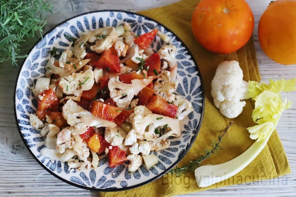 Voor dit gerecht is geen koken nodig, alles is rauw en in seizoen. Schil de sinaasappels, verdeel de plakjes en snijd elke plak in vier delen en verwijder de pitten. Was daarna het hart van de bleekselderij en snijd het in kleine schijfjes. Evenzo, na het wassen en drogen van de bloemkool, snijd het in kleine stukjes. Emulgeer in een kleine kom de extra vergine olijfolie, met de balsamico azijn, het zout en de fijngehakte bieslook, ik gebruik een schaar voor het gemak, meng enkele minuten. Nu alles klaar is, assembleer de ingrediënten met de smaakvolle emulsie. Plaats de sinaasappels, bloemkool en bleekselderij afwisselend in een grote kom en breng op smaak met de emulsie. Roer en verdeel over serveerschalen.