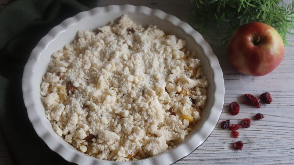 Een manier om de crumble krokanter te maken is door tijdens het koken bij de appels amandelen toe te voegen (zoals ik in dit recept heb gedaan), of walnoten of geroosterde hazelnoten.