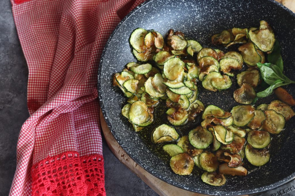 Voeg de gebakken courgettes toe en laat ze smaken. Voeg voldoende basilicum toe en breng op smaak met zout.