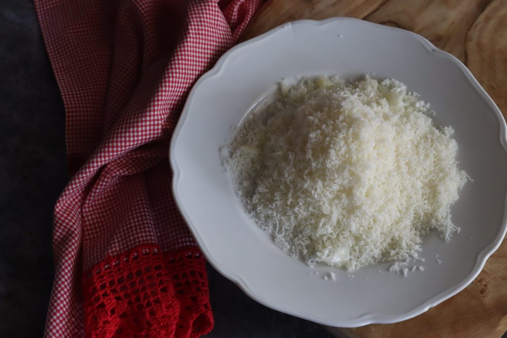 Rasp de provolone of, als alternatief, de caciocavallo.