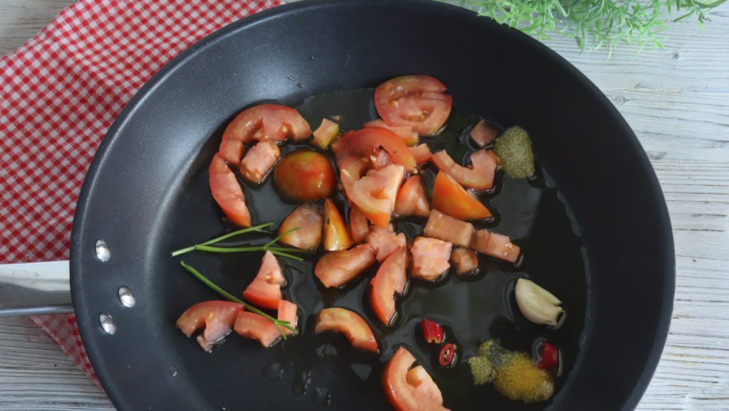 Doe de geplette knoflook met de peper en de extra vergine olijfolie in de pan, ik voeg ook de steeltjes van de peterselie toe en verwijder ze aan het einde van de bereiding, laat enkele minuten lichtjes fruiten en voeg de in stukjes gesneden tomaten toe.