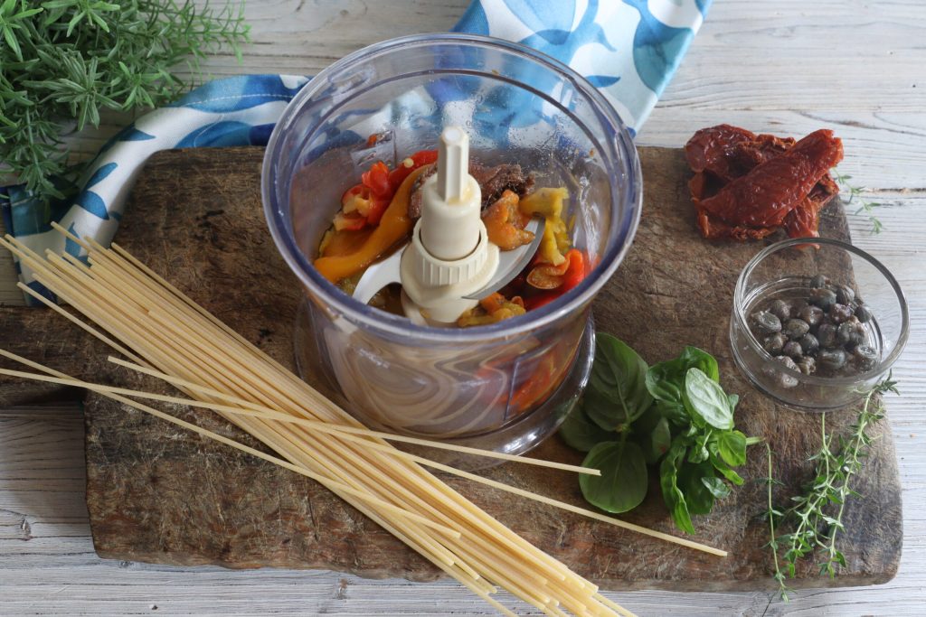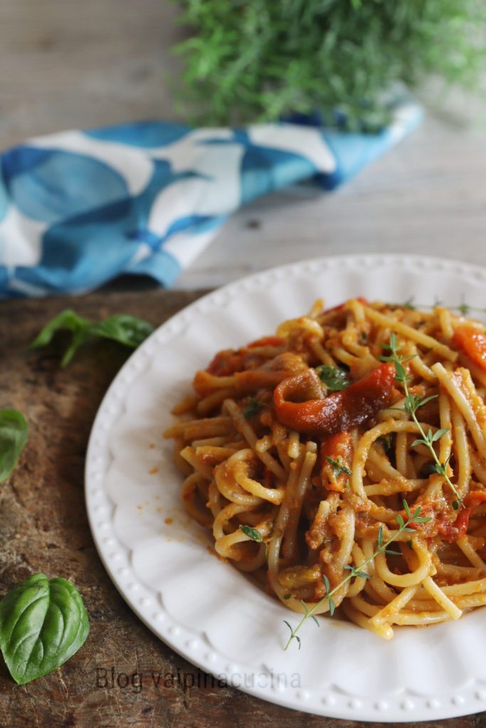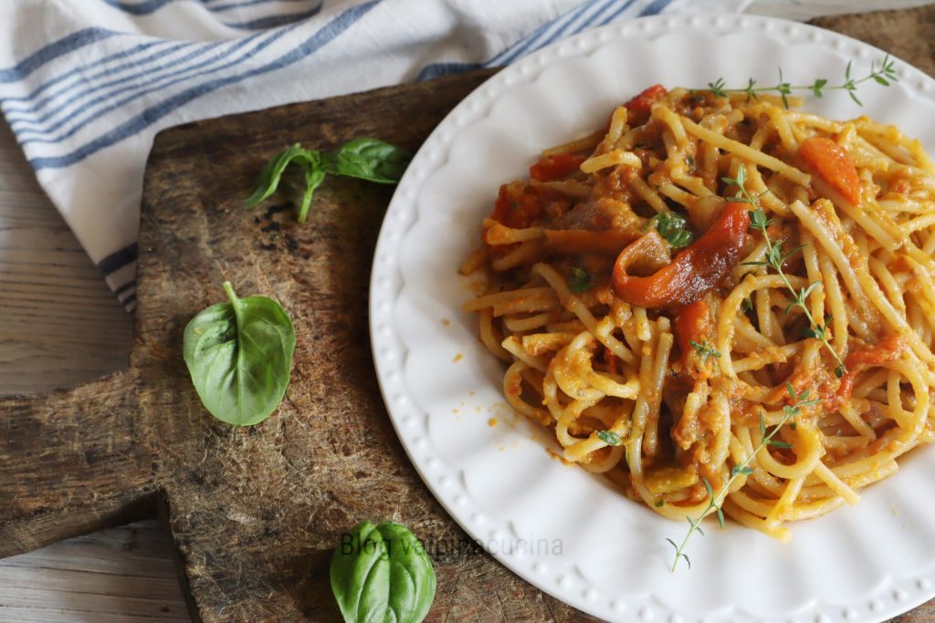 Spaghetti met paprikacrème, kappertjes en ansjovis, een echte delicatesse om pasta mee op smaak te brengen en op geroosterd brood te smeren. Op het eerste gezicht lijkt het een heel moeilijk gerecht om te maken, maar in werkelijkheid is het heel eenvoudig en handig. Handig omdat het ingevroren kan worden en een beetje zoals pesto kan worden gebruikt, wanneer nodig, met 60 seconden in de magnetron ontdooit het en is het klaar om de pasta op smaak te brengen.