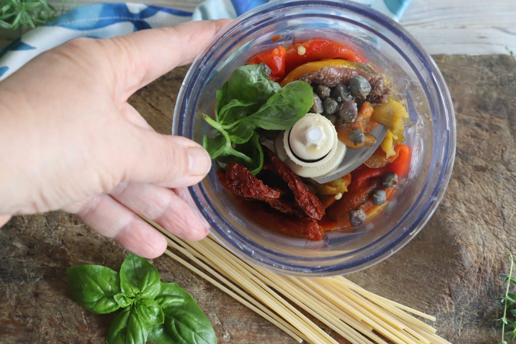 Doe de ingrediënten in de hakmolen: de gepelde paprika’s, de ansjovis met de ontzouten kappertjes, basilicum met de olie, de zongedroogde tomaten met de extra vergine olijfolie, het water en een paar takjes tijm.