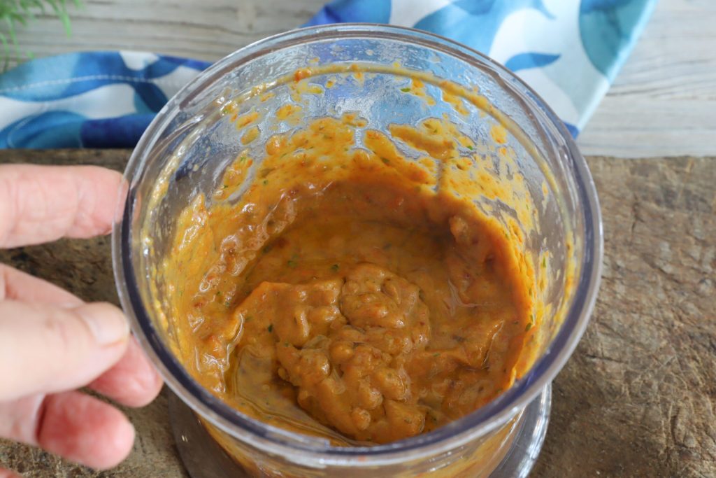 Start de hakmolen voor een paar seconden, stop en herhaal dit nog twee keer; zo voorkom je dat de messen warm worden en daarmee de paprikacrème. Om deze reden kun je het water vervangen door ijs.
