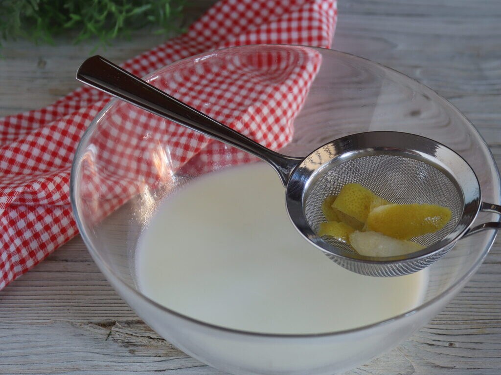 Voor het maken van de room, verwarm ik de melk met suiker en citroenschillen in een pannetje.