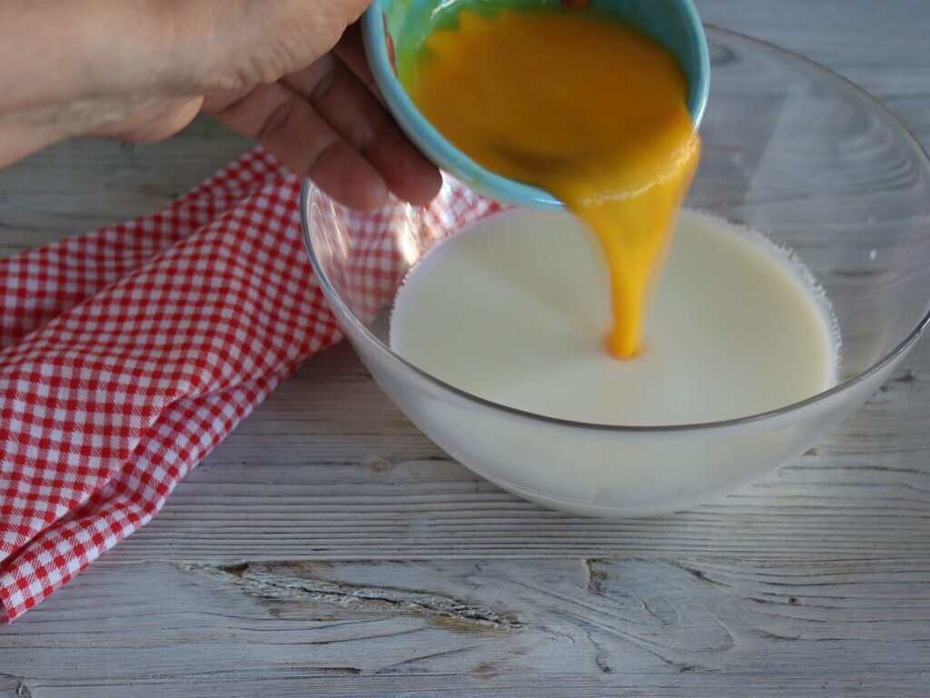 In een kommetje klop ik de eieren lichtjes en voeg ze toe aan de lauwe melk.