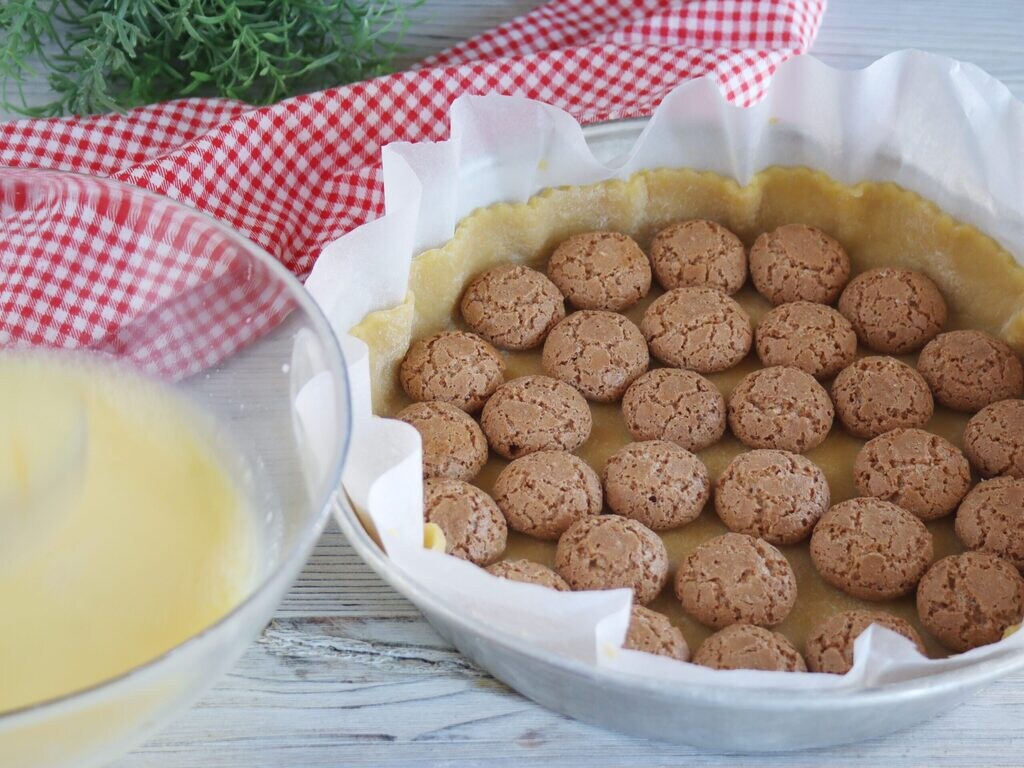 Ik rol het uit op het bakpapier en leg het direct in de bakvorm, leg de amaretti in een cirkel op het deeg met een lichte druk.