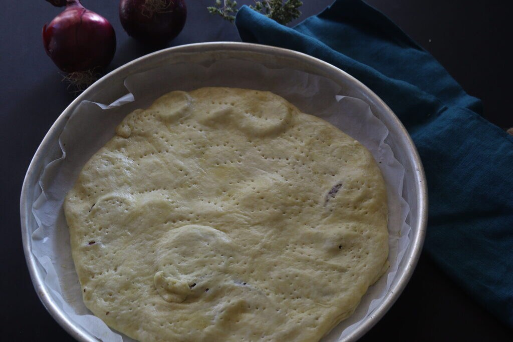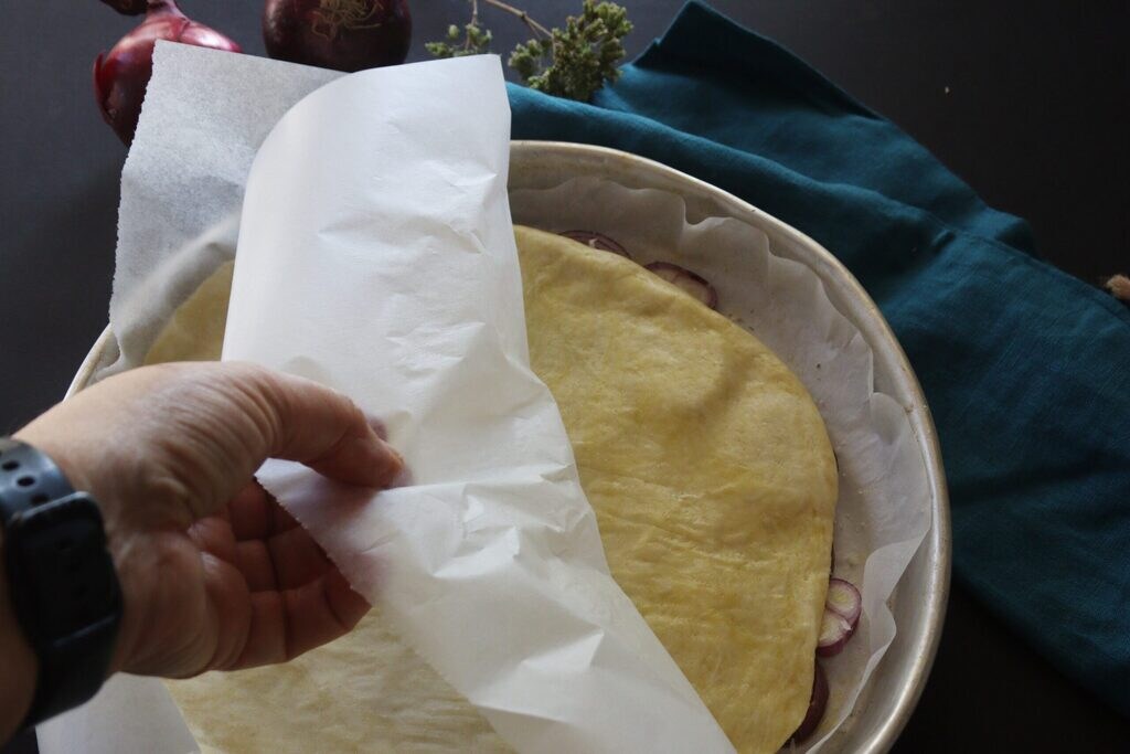 Druk het brisédeeg goed aan op de uien en prik erin met een vork. Bak in een voorverwarmde oven op 180° voor 30 minuten.