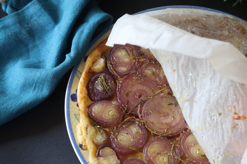 Zodra de tarte tatin van ui klaar is, leg je het op een bord en draai je het om, verwijder voorzichtig het bakpapier.