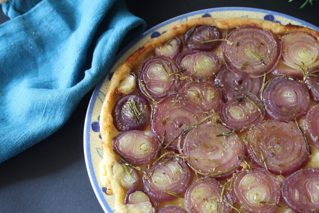 Tarte tatin van Tropea uien, laten we meteen zeggen dat de tarte tatin een taart is (meestal is het origineel een typische Franse appeltaart) ondersteboven waarbij het fruit en in dit geval de uien gekarameliseerd zijn. Laten we meer te weten komen over de uien. Er zijn veel soorten uien, die we voor het gemak samenvatten in drie groepen: de rode, de gouden en de witte die we allemaal natuurlijk kennen. De rode en gouden zijn herfstig, en hier komen de Tropea’s, zoet met een unieke smaak die ik vandaag zal gebruiken voor mijn tarte tatin en dan zijn er de zomerse, de witte. Ik vermeld dat het hele jaar door alle soorten uien op de markt zijn, en natuurlijk ook die van Tropea. De Tropea uien zijn er namelijk vanaf oktober en tot en met maart.