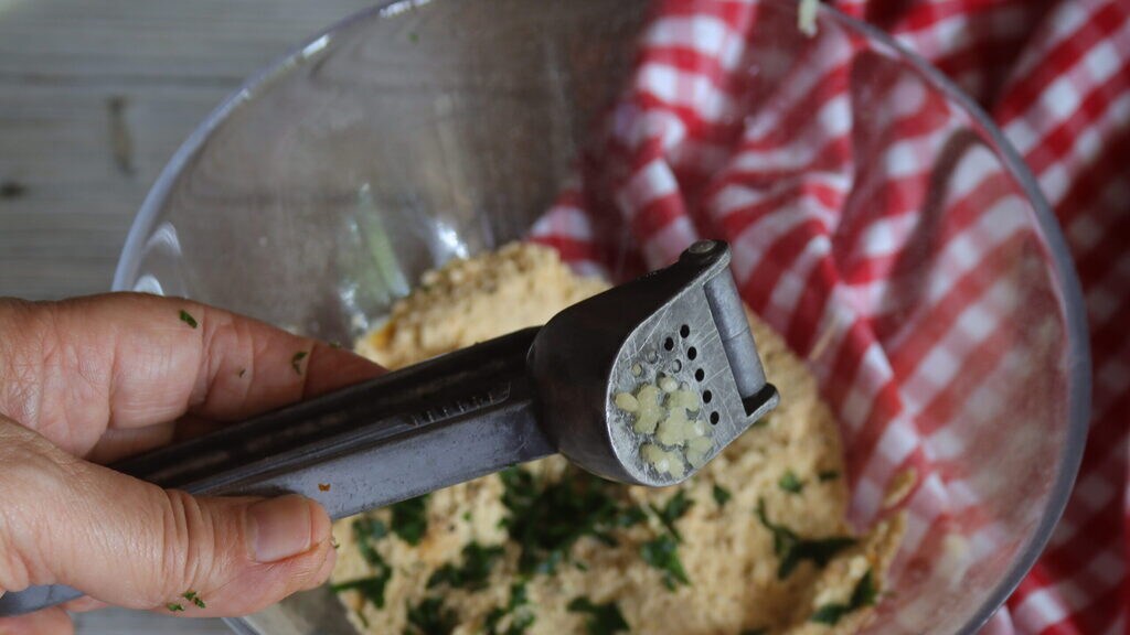 Pers de knoflook en voeg toe samen met de extra vergine olijfolie, de gehakte peterselie