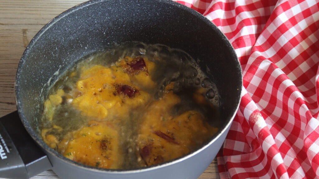 Verwarm de arachideolie in een pan tot 170° en gebruik een lepel om porties in de hete olie te gieten en bak de uienbeignets