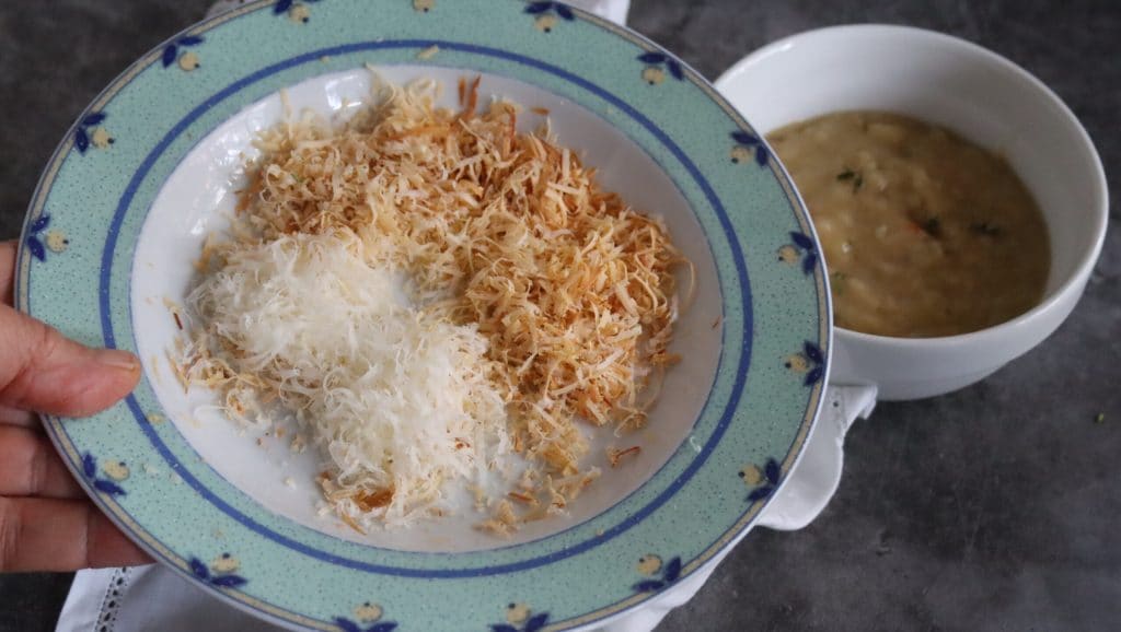 Rasp de emmenthal en verdeel het over de kommetjes samen met de gerookte gezouten ricotta.