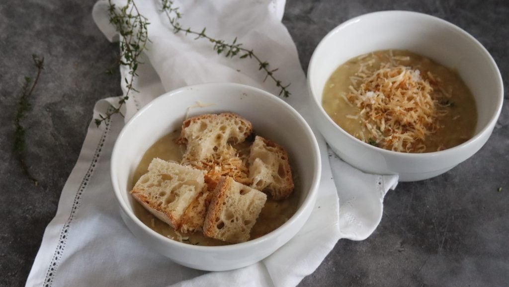 Strooi er verse tijm over en serveer de uiensoep nog kokend heet.