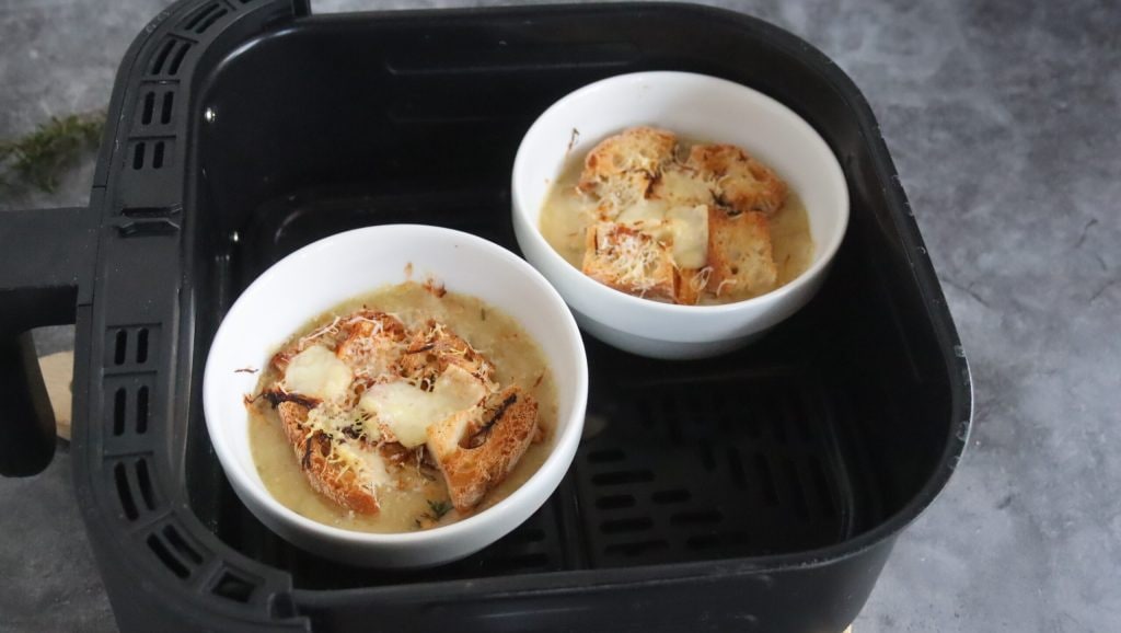 Voeg enkele broodblokjes toe of een paar hele plakken per kom uiensoep.