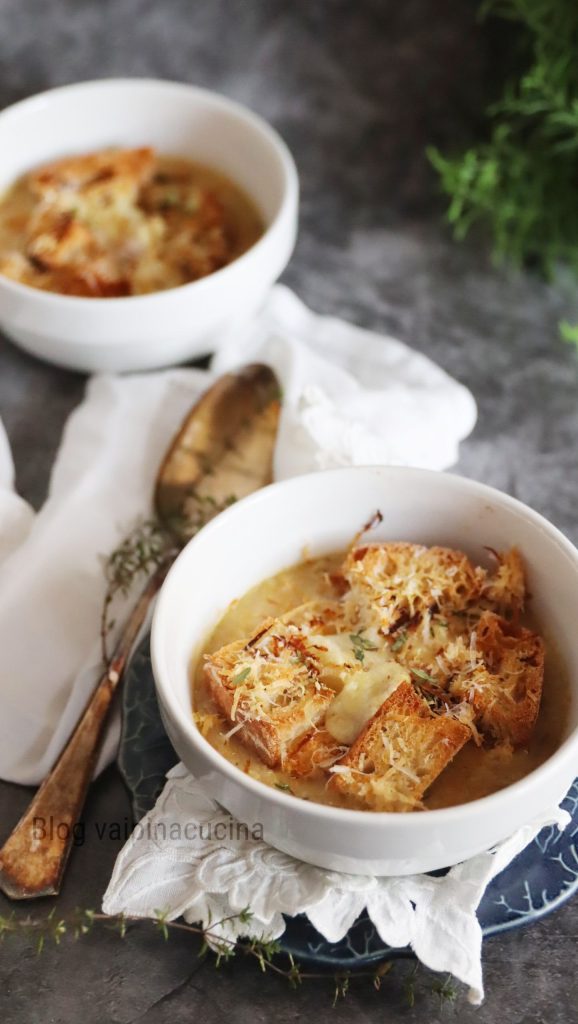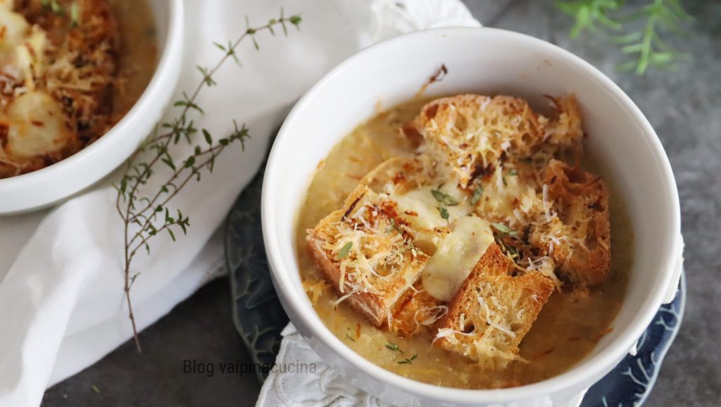 In de oven gegratineerde uiensoep met croutons en emmenthal, een genot. Perfect om op te warmen tijdens lange winteravonden, maar ook heerlijk in andere seizoenen. Oorspronkelijk afkomstig uit Frankrijk als soupe à l’oignon, de uiensoep. Het is een typisch gerecht uit de Franse keuken. Volgens enkele legendes zou Lodewijk XV, overvallen door plotselinge honger, en in een jachthuis ver van zijn verblijf, alleen uien, champagne en boter in de voorraadkast hebben gevonden en deze uiensoep hebben gemaakt. Een andere mogelijke legende vertelt dat de komst van de uiensoep samenviel met de komst van Catherine de’ Medici naar Frankrijk voor het huwelijk met koning Hendrik II van Orléans.